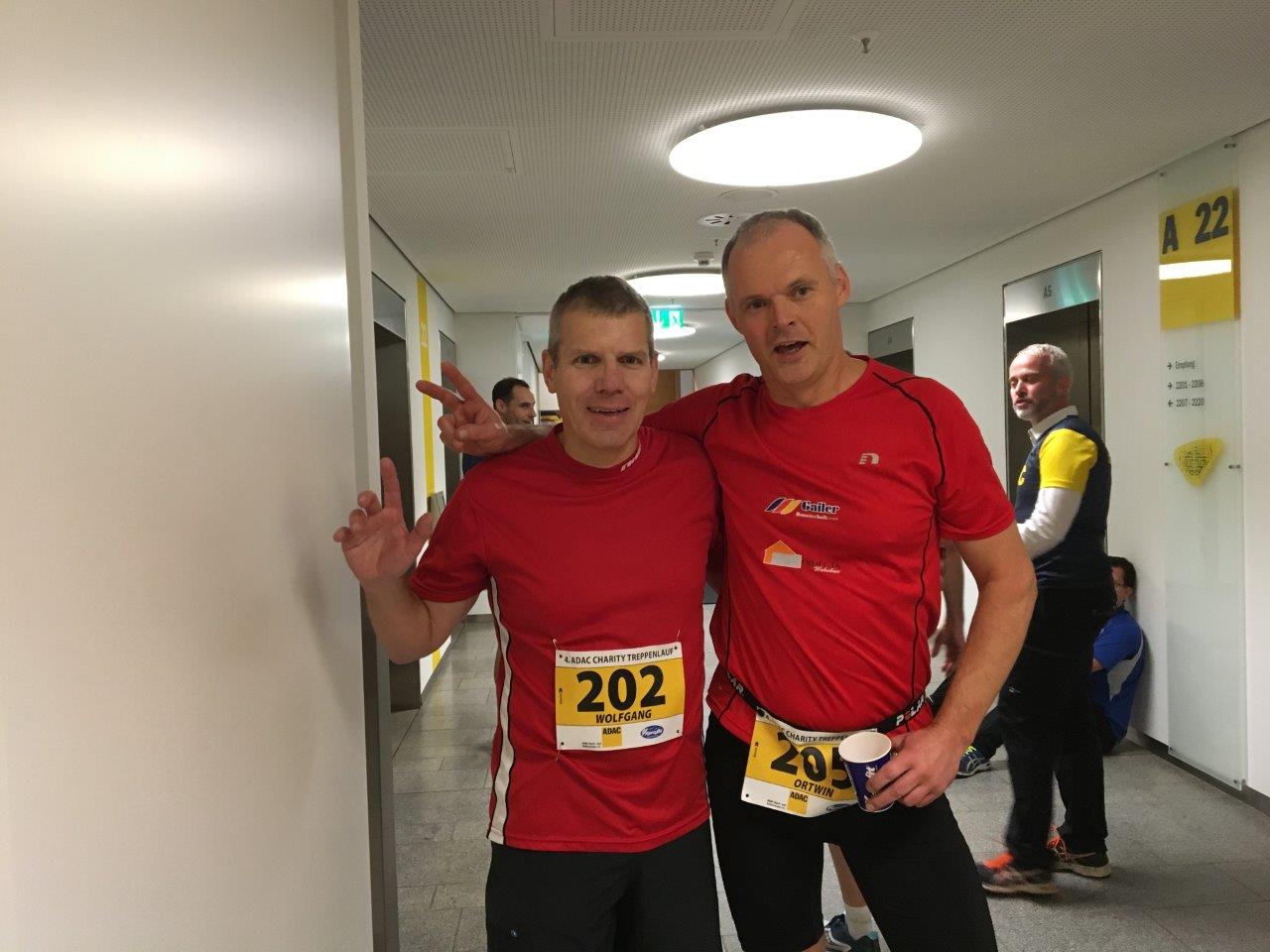 suchten sich Dr. Wolfgang Walter und Ortwin Ziehm am vergangenen Donnerstag aus. Beim 4. ADAC-Charity-Treppenlauf ging es im Hauptquartier der Gelben Engel von null in den 22. Stock über 472 Treppen. Etwas außer Atem und hustend, was der sehr trocknen Luft im Treppenhaus geschuldet war, erreichten die beiden zufrieden das 45 Meter höher liegende Ziel.