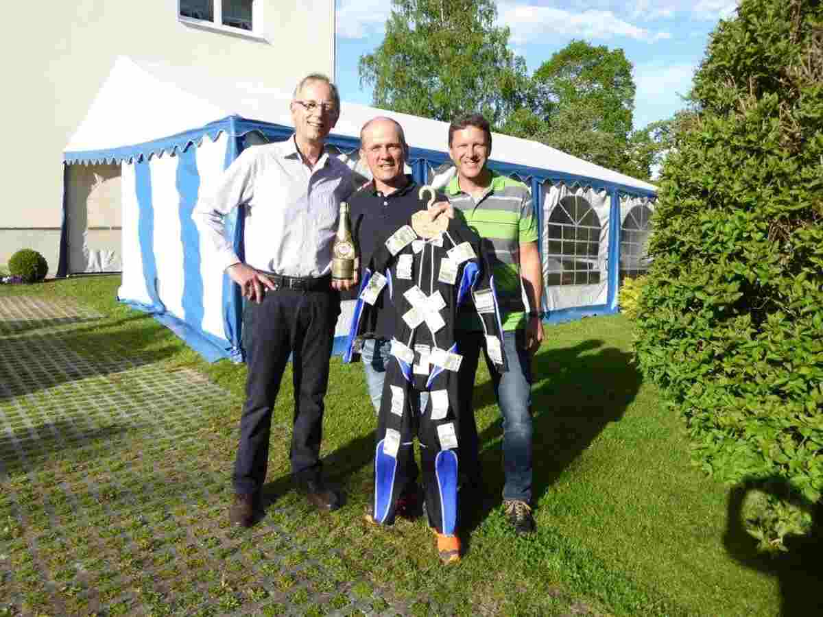 Jürgen Krüger und Manfred Zankl gratulierten Andy Maier zum halben Jahrhundert und überbrachten Präsent und Glückwünsche der SG Indersdorf.