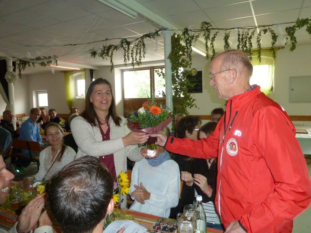 Mit einem Blumenstrauß bedankte sich SG Vorstand Michael Rauch bei Sabine Gailer für die erneute Unterstützung durch die Fa. Gailer Haustechnik in Form einer großzügigen Spende von Wettkampftrikots und T-Shirts für die SG Indersdorf.