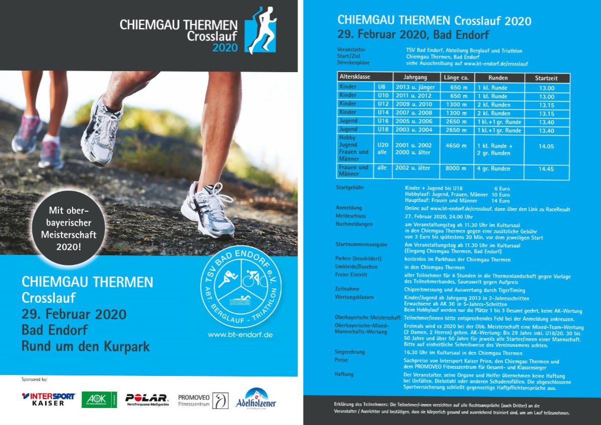 Der Termin des Chiemgau Thermen Crosslaufes hat sich geändert. Diese Veranstaltung beinhaltet die oberbayerische Meisterschaft. Neuer Termin: