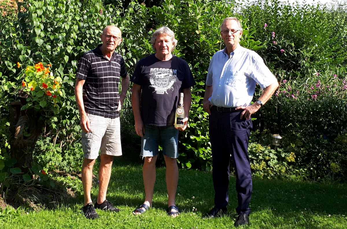 Das schöne Wetter, guten Kaffee und Kuchen nutzten die Vorstände Michael Rauch und Jürgen Krüger um mit dem Jubilar Werner Hambrecht über viele tolle gemeinsame Lauferlebnisse zu plaudern.