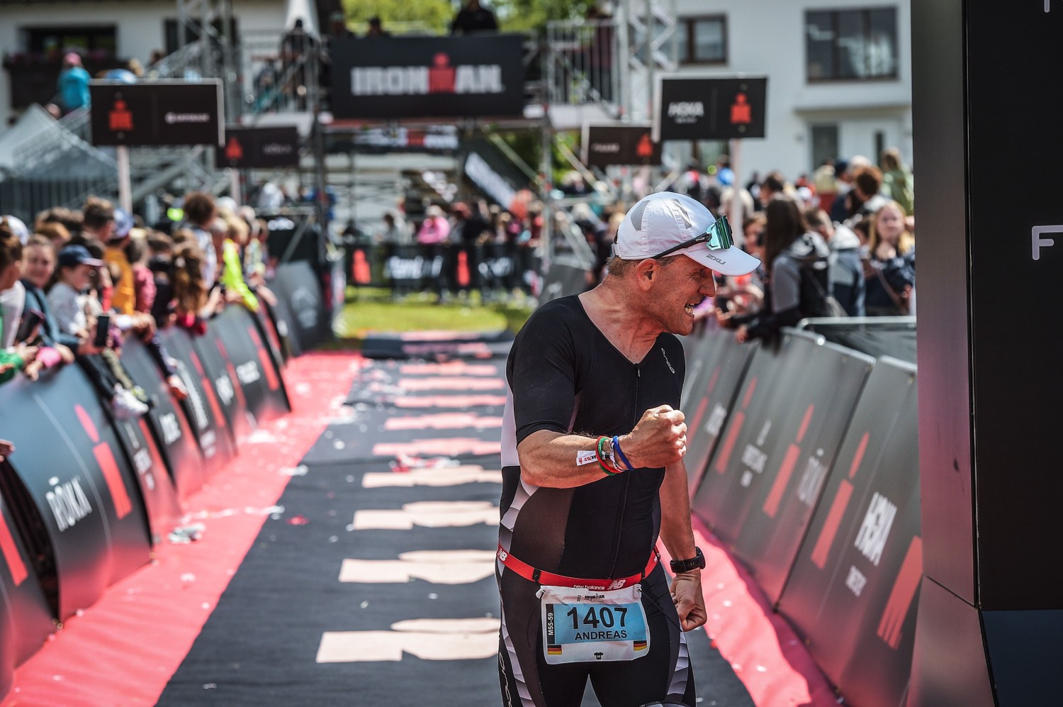 Am Sonntag, den 29.05. fand in Bad Schönborn im schönen Kraichgau ein Ironman 70.3 statt. Für Nicht- Insider zur Erklärung: Die 70.3 bezieht sich auf die Gesamtstrecke des Triathlons gemessen in Meilen, umgerechnet 113 km. Die Teilstrecken: 1,9 km Schwimmen, 90 km Radfahren und 21,1 km Laufen. Über 2400 Teilnehmer:innen fanden sich bei kühlen 11 Grad Lufttemperatur am Hardtsee zur Auftaktdiziplin ein. Dank einem Rolling Start, bei dem im Zeitabstand von 5 Sec. immer nur 5 Athlet:innen starten, wurde die anfängliche „Klopperei“ beim Wasserstart deutlich entzerrt. Die 20 Grad Wassertemperatur waren zwar frisch, sollten aber das wärmste für den größenteil des Tages bleiben. Anschließend ging es auf die Radstrecke bei der man schnell merkte warum man das Kraichgau das Land der 1000 Hügel nennt. Zu allem Überfluss begann es auch noch zu regnen. Trotz der schlechten Witterung ließen es sich viele Zuschauer nicht nehmen, die Sportler:innen auf der Strecke anzufeuern. Kurz vor dem 2. Wechsel, in Bad Schönborn, kam dann sogar die Sonne raus. Dort angekommen ging es auf die Laufstecke, die wie soll es im Kraichgau auch anders sein, ein paar kleinere Anstiege bereit hielt. Die Strecke war als 7 km langer Rundkurs abgesteckt. Dieser musste 3x durchlaufen werden, bevor man endlich in die Zielgerade abbiegen durfte. Die Stimmung an der Laufstecke war grandios. Überall Zuschauer die die Athlet:innen lautstark unterstützten. Von harten Beats aus Lautsprecherboxen, über Tröten und Laola- Wellen war alles vertreten. Im Ziel angekommen dufte man sich so richtig feiern lassen und im anschließenden Athletengarten war Schlemmen angesagt. Mit Obst, Kuchen, Pizzastücken und sogar Maultaschen wurde alles angeboten um die leeren Energiespeicher wieder schnell aufzufüllen. Großen Dank gilt wie immer den vielen fleißigen Helfern. Für die SG- Indersdorf war Andi Maier am Start. Mit einer Gesamtzeit von 5:55:19 Std. konnte er sich eine gute mittlere Platzierung im internationalen Starterfeld der AK M 55-59 sichern.