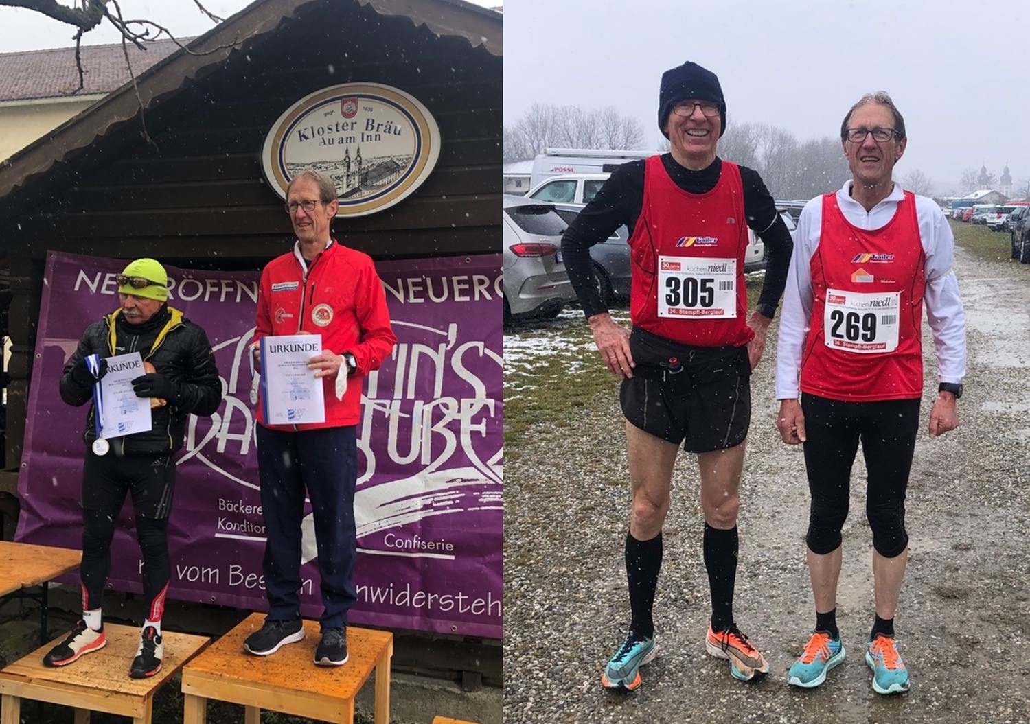 Mit der Sommerzeit kam auch der Winter zurück. Und so sah das dann auch am Samstag in Au am Inn aus. Schneetreiben, Temperaturen um den Gefrierpunkt und eine schneebedeckte Landschaft. Aber auch diese Voaussetzungen hinderten viele Läufer nicht, am traditionellen Stampfl-Berglauf teilzunehmen. In seiner 36. Auflage wieder mit der Oberbayerischen Meisterschaft im Berglauf. Neben zahlreichen Lokalmathadoren aus den umliegenden Gemeinden traten auch zwei Läufer der SG Indersdorf an. Auf dem 4,2 km langen Kurs, der über 3,2 km Strasse und 1 km Feld- und Wiesenwegen verlief, waren 200 Höhenmeter zu überwinden. Dies gelang Gerhard Seitz in einer Zeit von 23:00 min und damit zum Meistertitel in der AK 65. Nicht ganz fürs Stockerl hat es bei Konrad Wallner gereicht, der in hervoragenden 24:08 min die Ziellinie querte und damit den 4. Platz in der AK 60 errang. Dank an den SC Haag für die Veranstaltung und die gelungene Durchführung.