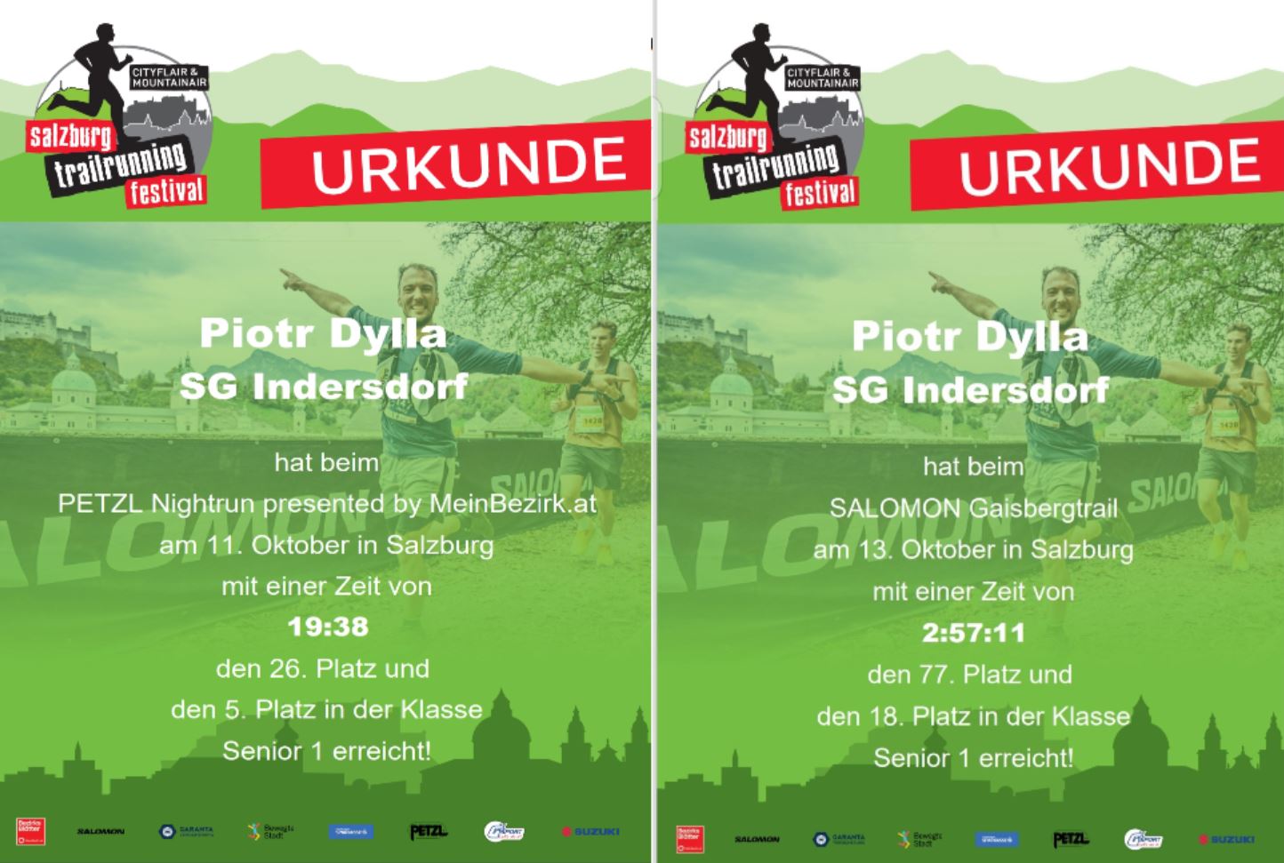 „Der Salomon Gaisbergtrail startet am Kapitelplatz, im Herzen der Salzburger Altstadt. Von der Altstadt führt die Strecke über den Kapuzinerberg (Basteiweg entlang der Stadtmauer, 1.718 Stufen!) hinauf zur Gaisbergspitze. Von dort geht es über herrliche Trails und anspruchsvolle Downhills Richtung Campingplatz Aigen und wieder zurück in die Stadt entlang der Salzach mit Zieleinlauf am Kapitelplatz. Einer der härtesten Halbmarathons mit atemberaubender Kulisse warten auf euch, ein Trail-Bewerb für Abenteuer!“, so der Pressetext des Veranstalters. Einer dieser Abenteurer war Piotr Dylla. Er meisterte diese Strecke mit 1.344 HM - trotz Nässe - in 2:57:11 h und war damit 11 min. schneller als im vergangenen Jahr. Zum Auftakt dieses Trailfestivals fand am Freitag, 11. Oktober, der Petzl Nightrun, presented by MeinBezirk.at, statt. Dieser Lauf führt die Läufer zur Salzach und entlang dem Kai bis zum Müllnersteg. Dann führt die Strecke durch den wunderschönen Mirabellgarten und die historische Steingasse. Wieder retour über die Salzach wird durch den Stadtteil Nonntal gelaufen, von dort geht´s hinauf zur Nonnberggasse von der man einen schönen Blick über die Dächer von Salzburg hat. Über die Festungsgasse kommen die Läufer nach 5,5 km wieder zurück zum Kapitelplatz von der nächtlichen Sightseeingtour. Diese Vorbereitungstour absolvierte Piotr in 19:38 min.