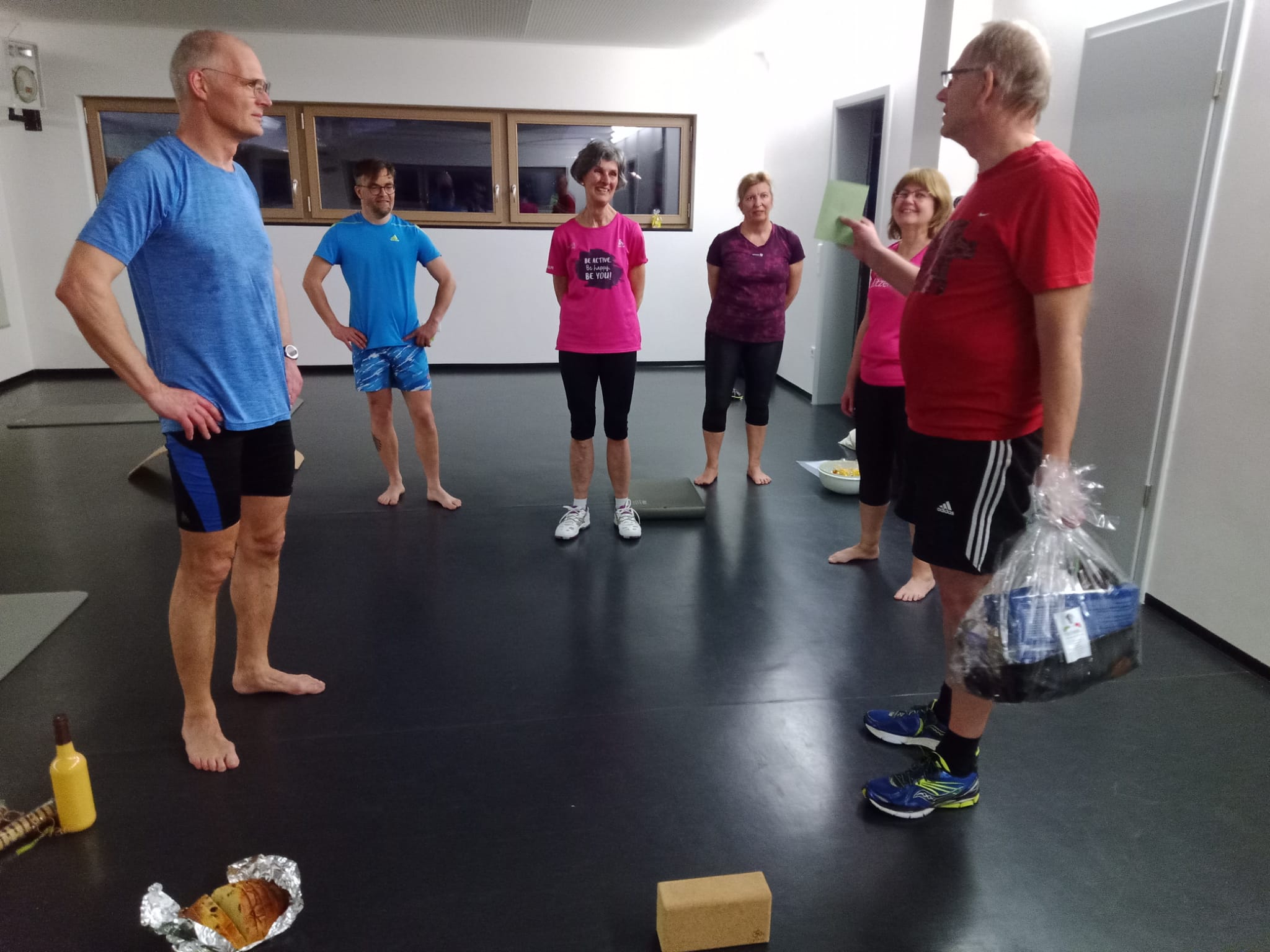 Vollkommen überrascht war Ortwin Ziehm am Ende der letzten Athletiktraining-Stunde, als Vorstand Jürgen Krüger sich im Namen des Vereins für die 20 Freitagabende mit einem Geschenkkorb bei ihm bedankte. In diesen 20 Wochen gab es zum Teil schweißtreibende Einheiten, die vorwiegend der Kräftigung dienten, dann aber auch wieder eher ruhigere, bei denen Koordinations- und Balanceübungen im Vordergrund standen, sowie an drei Abenden sogar Yoga-Einheiten mit Gina Schneider. Dieses letzte Training in der Saison 2023/24 klang mit vorösterlichen Köstlichkeiten bei einem gemütlichen Zusammensein im Übungsraum von Christian Schuster aus. Auch an ihn herzlichen Dank für die Überlassung der Räumlichkeiten. Für die Wintersaison 2024/25 ist dieses Training wieder geplant.