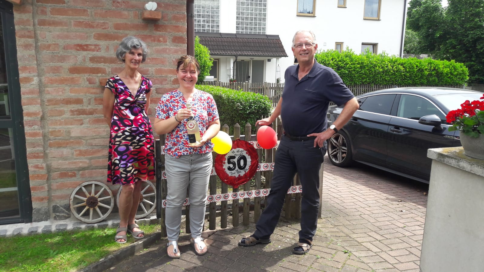 Zum Runden Geburtstag von Sabine König gratulierten Vorstand Jürgen Krüger mit Frau Bärbel und überreichten das Vereinspräsent an die Jubilarin.