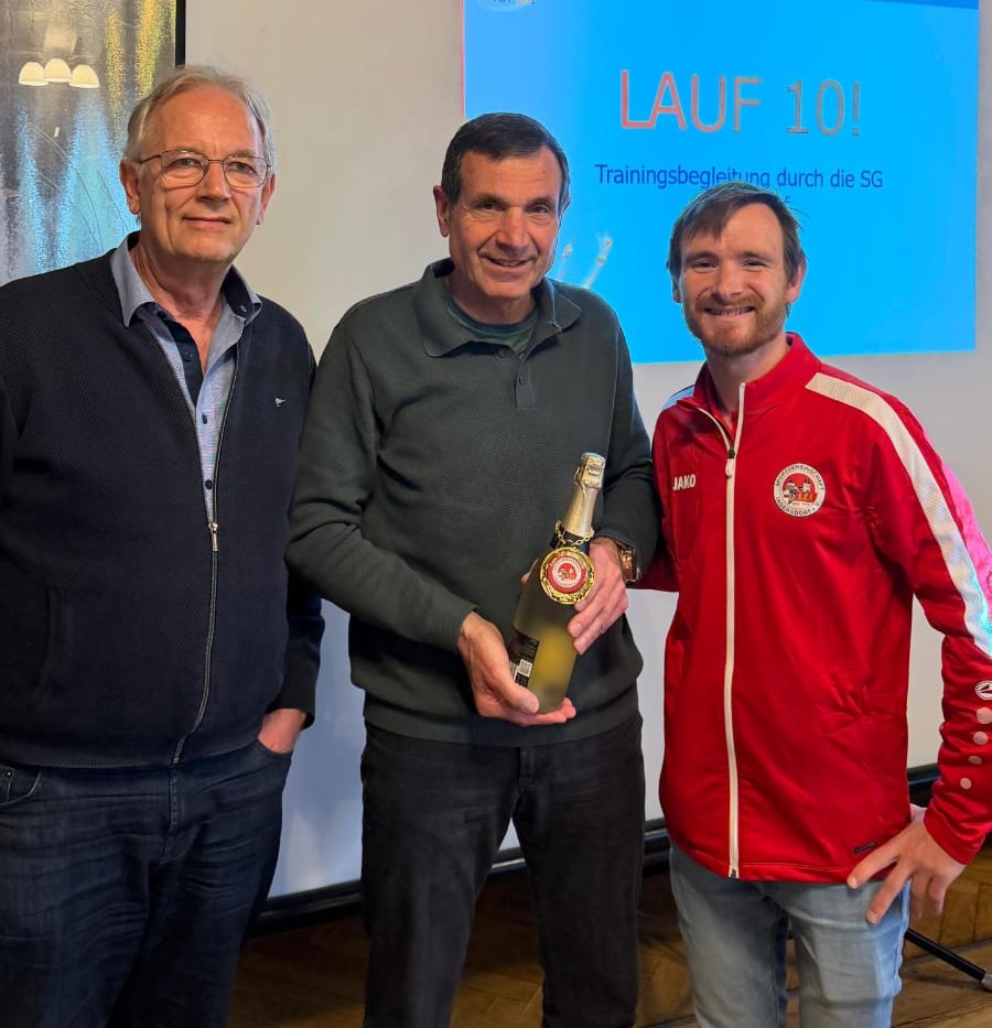 Zwei Jubilare zur gleichen Zeit am gleichen Ort – diese besondere Gelegenheit ließen sich die beiden Vorstände der SG Indersdorf nicht entgehen und überreichten Wolfgang Grau und Leo Lechner ein Vereinspräsent.